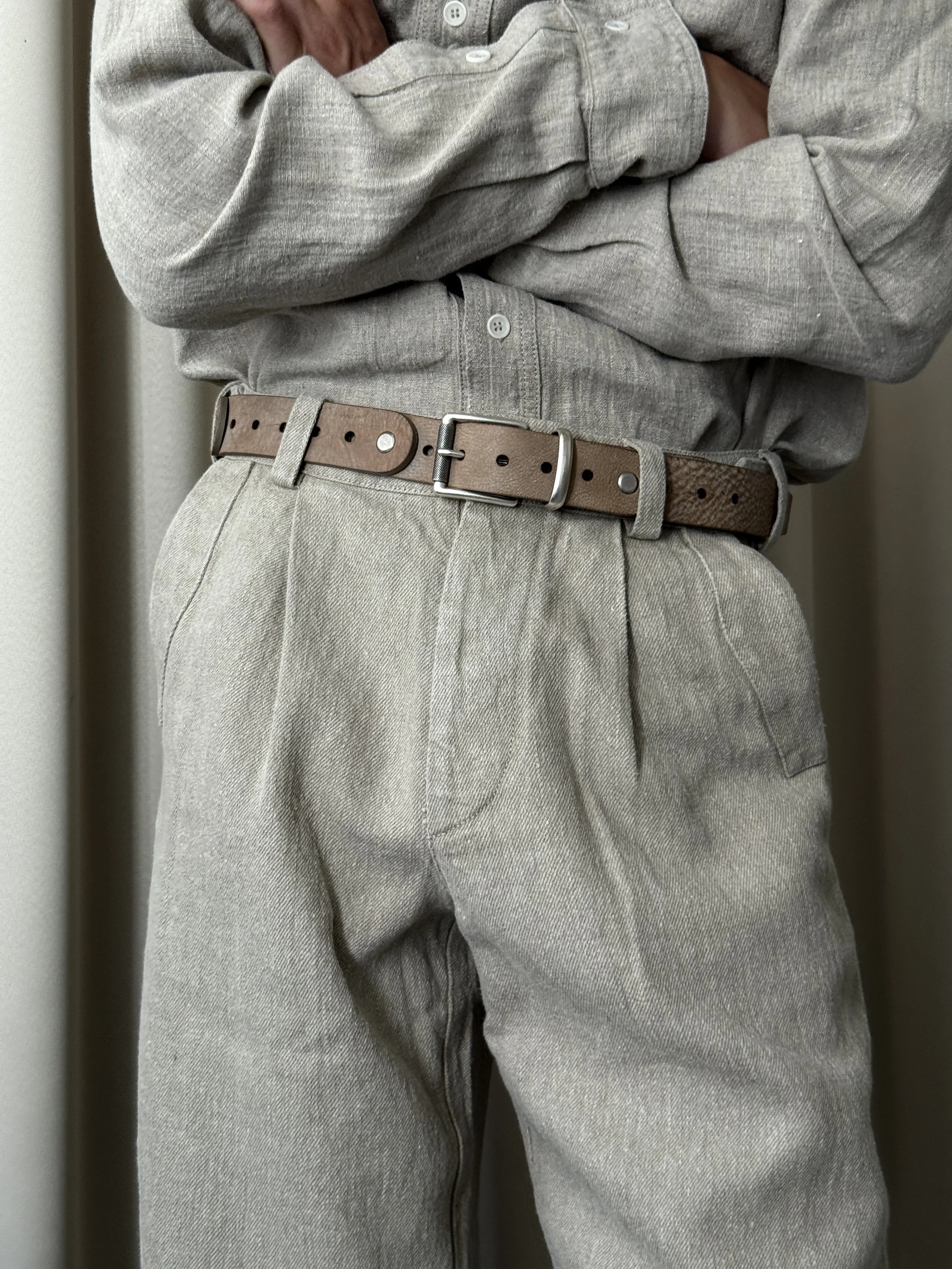 Patterns are drafted around how linen and leather naturally behaves — the drape of linen tabby, the stability of heavy twill, the structure of thick full-grain leather.